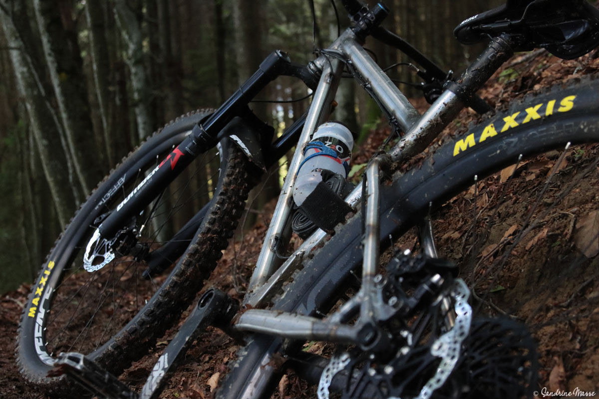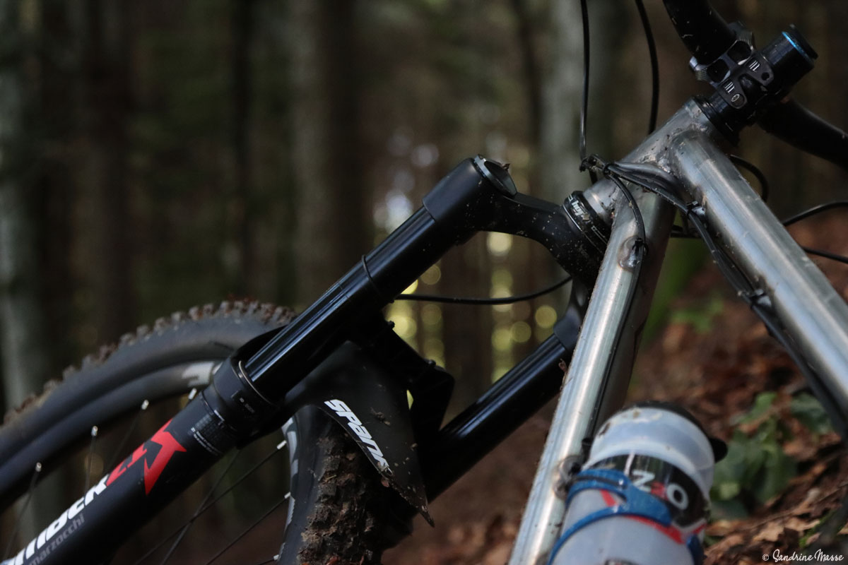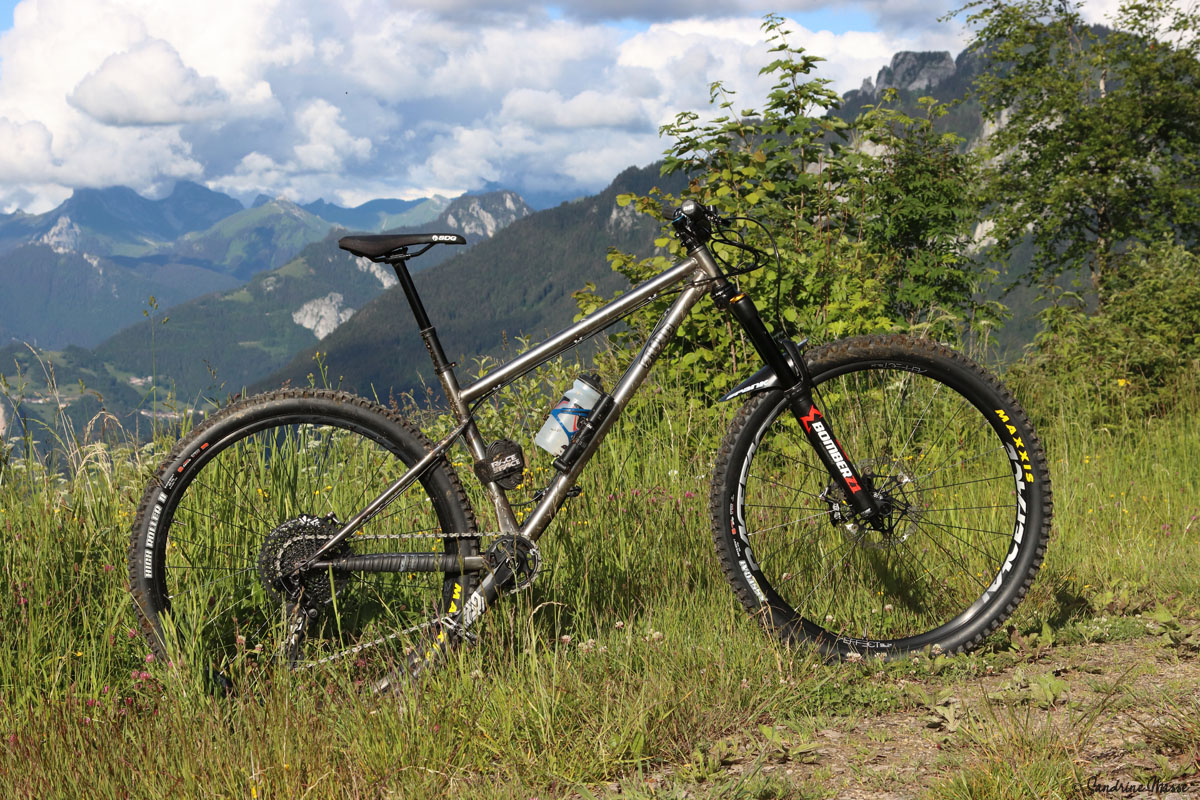 Ce premier cadre est un VTT assez radical, on parle d’enduro hardtail ou d’endurigide. Il est prévu pour une fourche de 160mm de débattement et la géométrie permet des tests en montage de roues 29"/29" ou 27,5"/29" (Mullet Bike).