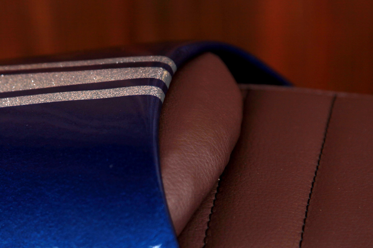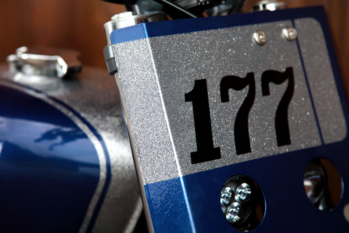 Pour la finition on choisit de la couvrir de metal flakes argentés jumelés à un bleu métallisé. En fait c’est le même bleu que la W650 Age Of Glory, c’est amusant car il n’a pas du tout le même rendu aux côtés des flakes silver, qu’avec les touches dorées de la Kawasaki.