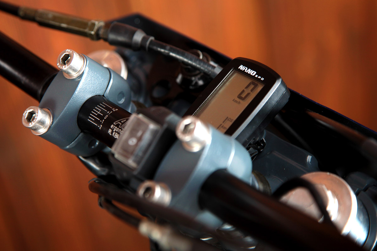 La selle sur mesure est plate et double (j’ajoute des cales pieds passager amovibles car ceux d’origine avaient été tronçonnés), mais je forme à la main un petit cul de selle juste pour le style en mode "solo". Sa fixation est invisible. En fait il vient envelopper l’arrière de la selle et est coincé par les vis de fixation de cette dernière.