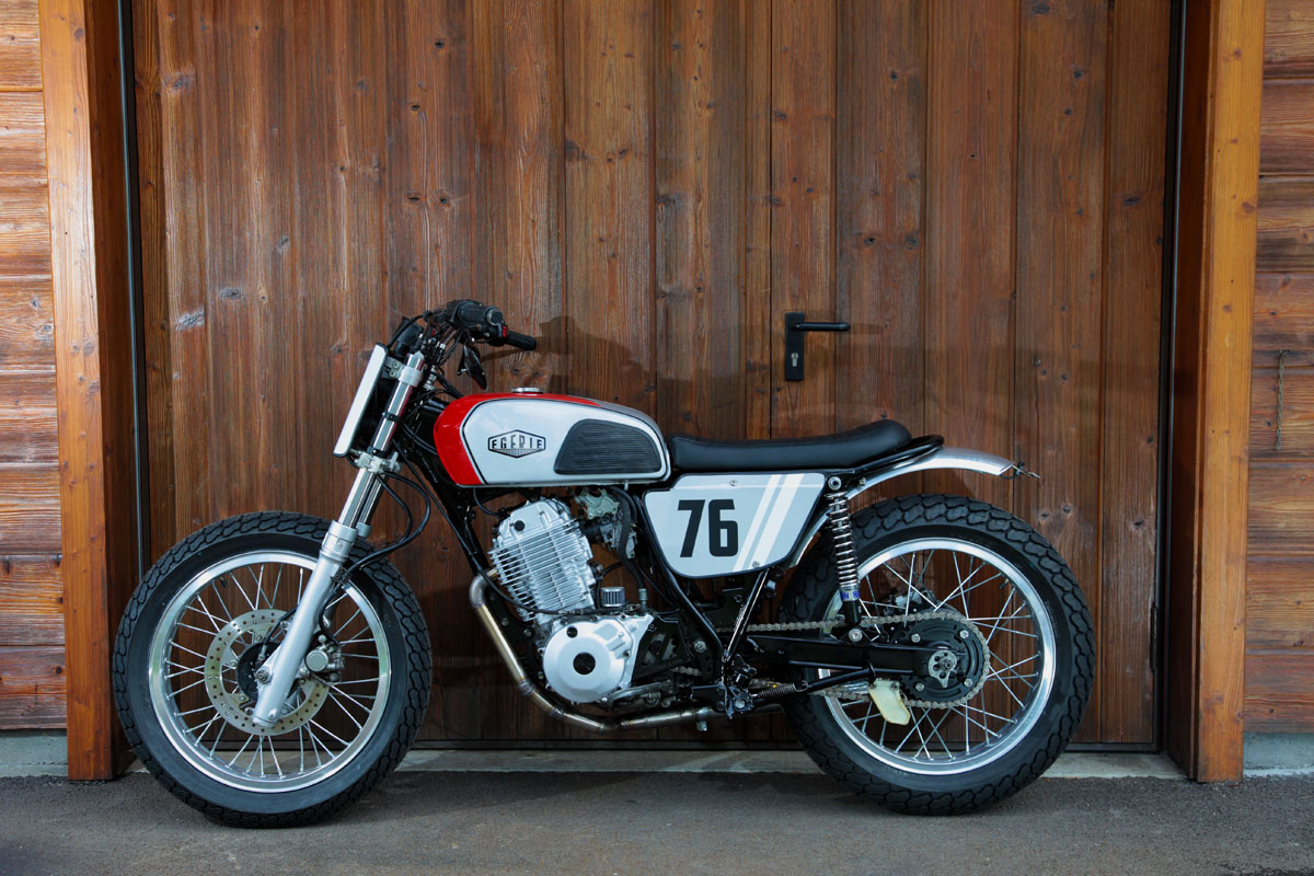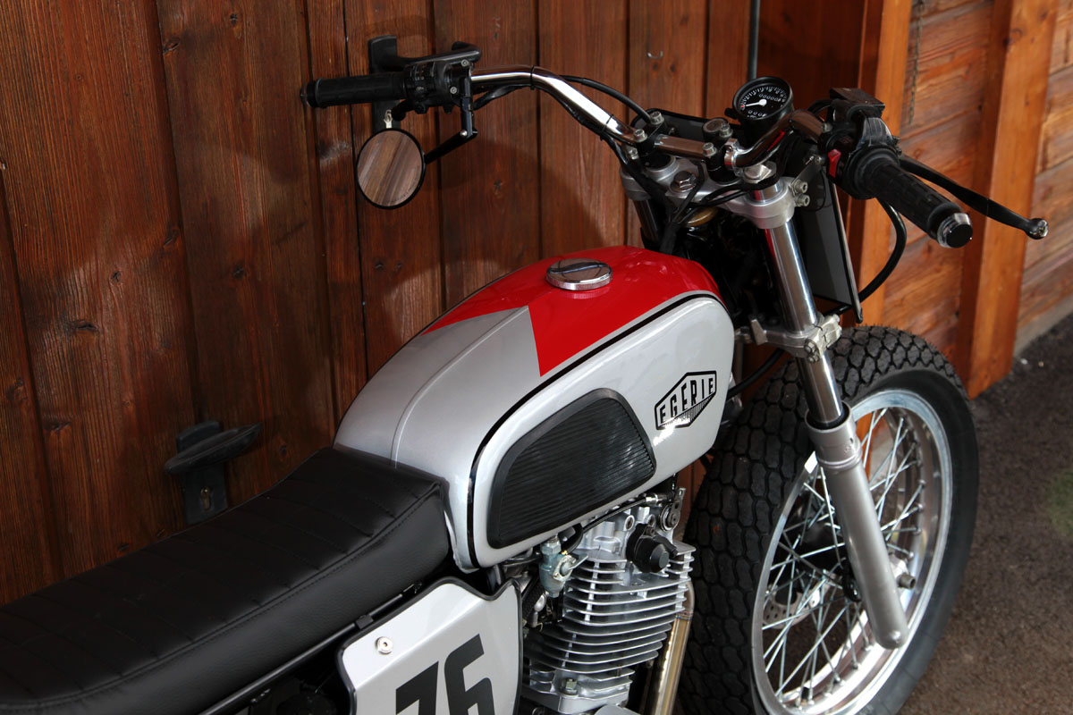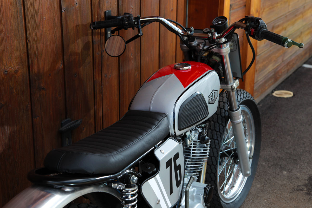 Pour le reste on fait les mêmes modifications : roues en 19" (pneus de flattrack Mitas homologués route), bi-amortisseur, échappement en position basse, drop de la fourche (qu’on garde d’origine pour ne pas rentrer dans une bidouille de frein à grand coups d’adaptateurs), boucle arrière, selle sur mesure etc.